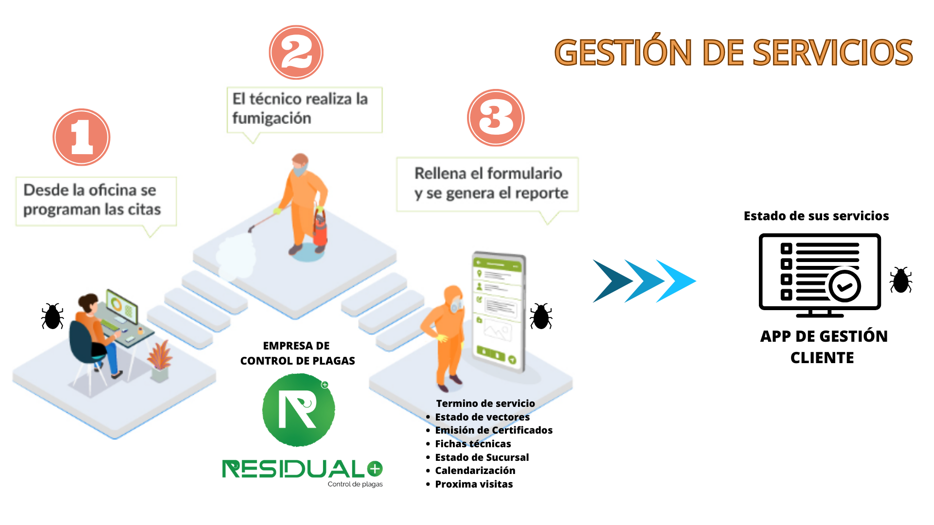 Contratando nuestros planes de servicios aplicación web y móvil, en donde tendrá acceso a control y visibilidad grafica de comportamiento de plagas en su Empresa y como son controladas.