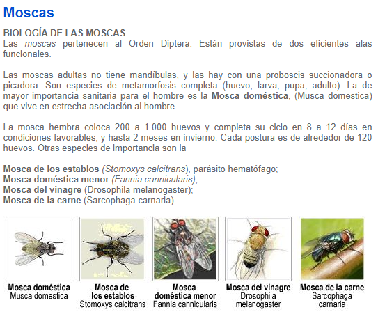 Algunas especies incluso pueden llegar a picar. La presencia de fuentes de alimentación facilita el establecimiento de colonias de moscas. Los periodos lluviosos seguidos de olas de calor aceleran el ciclo de vida de las moscas.